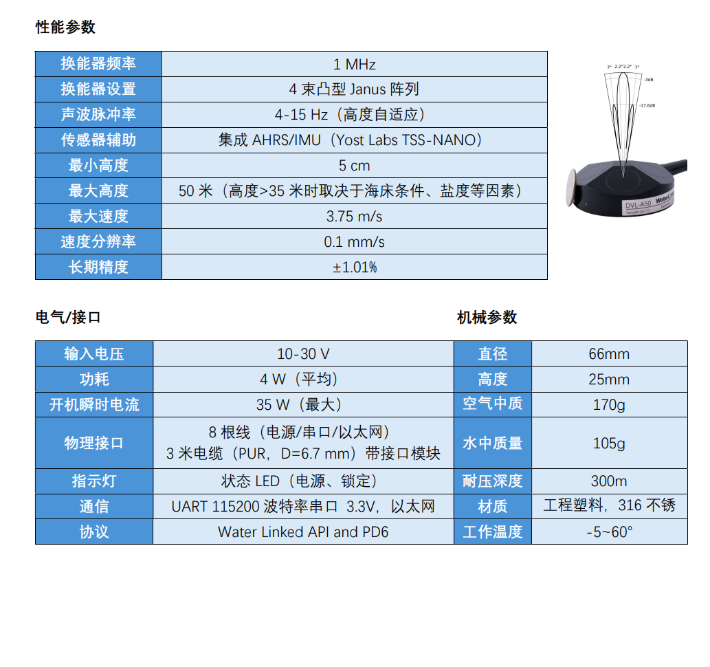 多普勒测速仪,商用高精度 DVL A50 是全球体积最小的多普勒计程仪(DVL)。 A50采用最新技术,体积小、成本低,性能水准超群。 A50 可输出精准的相对海底速度数据,助力水下航行器ROV/AUV与潜水员在强洋流、复杂地形等动态环境中,实现更高精度、更稳定的导航作业。 |